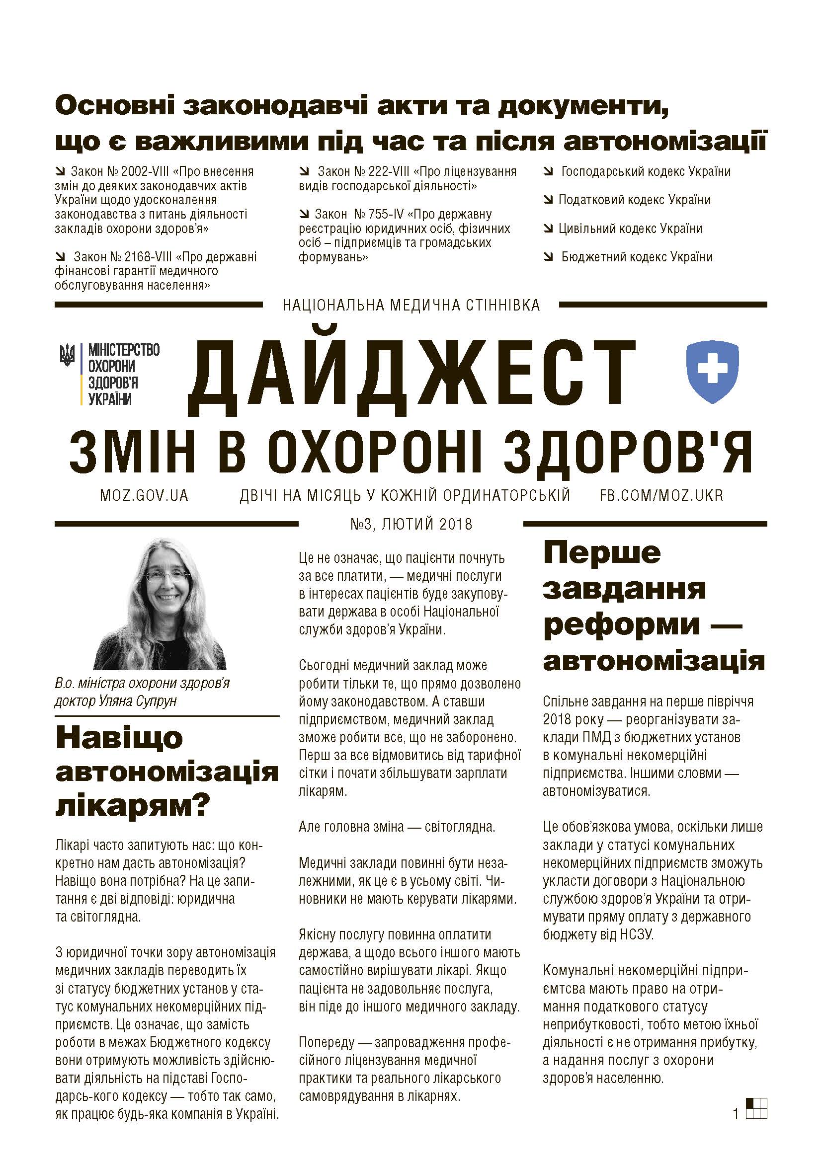 Дайджест змін в охороні здоров’я №3 Дата публікації: 01 Березня 2018 року. Опубліковано в Реформа МОЗ. Лікарі часто запитують нас: що конкретно нам дасть автономізація? Навіщо вона потрібна? На це запитання є дві відповіді: юридична та світоглядна. « Назад Вперед »