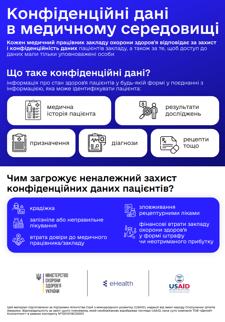 Електронна система охорони здоровʼя зберігає та обробляє медичні дані мільйонів українських пацієнтів. Вона надійно захищена. Персональні та медичні дані українців зберігаються в реєстрах у центральній базі даних, для них створено систему захисту інформації. Відповідальність за захист окремих медичних інформаційних систем несуть їхні розробники. Однак і медичні заклади відповідають за виконання передбачених угодою із МІС вимог щодо безпечної експлуатації цих систем.